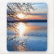 The sun rises every day! This landscape photograph captures the beauty of the blue and golden sky over a lake at dawn. It features the sunrise during golden hour through tree branches. The photo was taken on a cold winter morning.