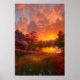 In the midst of nature lies a small and serene lake, its tranquil waters reflecting the hues of the sky above. Surrounded by lush green grass and vibrant red flowers, the lake serves as a sanctuary of peace and solitude. In the distance, the pink, red, and green trees sway gently in the warm breeze, as if in harmony with the peacefulness of the scene. Above them, the clouds part to reveal a golden sunset, casting its warm and radiant glow upon the land below.