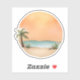 This peaceful watercolor artwork captures a golden sunset casting its warm glow over a serene beachfront. The sandy shore, accented by a graceful palm tree and lush greenery, creates a tranquil tropical escape. With its earthy tones and soft gradients, this piece is perfect for bringing a touch of the tropics to living rooms, bedrooms, or office spaces. Its circular design and minimalist aesthetic make it versatile for wall art, framed prints, or stickers.