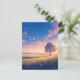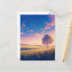 This ethereal postcard captures the breathtaking transition of a golden sunset into a star-studded night. A magnificent, solitary tree stands as the focal point, its leaves illuminated by the warm, amber glow of the fading sun. Below, a vibrant meadow of blue and purple wildflowers blankets the rolling golden hills. The sky above is a masterpiece of color, blending soft peach and pink clouds with a deep azure blue that reveals the first shimmering stars of the Milky Way. This postcard is perfect for sending a note of peace, a heartfelt thank you, or a wish of wonder to someone special.