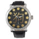 Golden Dog Symbol with an embossed digital effect in the centre of a black frame with hollowed-out circles showing the golden background for hours on watch. You can easily change background colour by clicking the customise button. Matching keychain, button, greeting card and more... Perfect for Chinese New Year of The Dog 2018 or Birthday (people born in Dog year). ---- "The Dog (狗) is one of the 12-year cycle of animals which appear in the Chinese zodiac related to the Chinese calendar. The Year of the Dog is associated with the Earthly Branch symbol 戌. The character 狗 refers to the actual animal while 戌 refers to the zodiac animal. (...) People born within these date ranges can be said to have been born in the "Year of the Dog", while also bearing the following elemental sign: