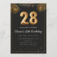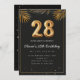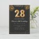 Adorable 28th birthday party invitation in a black and gold balloons design with golden tropical palm leaves. Customize with your party details and mail out to family and friends inviting them to celebrate the 28th birthday with style!