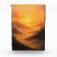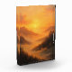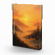 This is a breathtaking landscape painting depicting a mountain valley bathed in the intense, radiant light of a sunrise or sunset. The sky is dominated by a brilliant golden and orange glow, radiating from the central sun and illuminating the scattered clouds. The scene features deep, forested slopes on either side, their silhouettes providing a dramatic contrast against the vivid sky. A thick, ethereal mist or fog fills the valley floor, creating a sense of depth, mystery, and tranquillity. The style is highly atmospheric and evokes the grandeur of nature, suggesting a traditional or Romantic realism approach to painting.