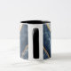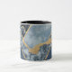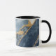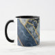 The image is a visually captivating abstract artwork that combines geometric shapes and organic wave patterns. The design features a harmonious blend of triangles, rectangles, and irregular shapes, all outlined with thin golden lines. The colour palette is dominated by various shades of blue, ranging from deep navy to light sky blue, complemented by patches of textured gold. The interplay between the cool blues and the warm gold creates a striking contrast that adds depth and richness to the composition.