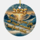 A luxurious winter design featuring golden 3D numerals "2025" crowned by delicate snowflake details. Set against a stunning mountain landscape at dawn, the scene blends deep winter blues with warm golden hues. Swirling golden text flows gracefully like ribbons through snowy peaks, creating a harmonious mix of elegance and natural beauty. Perfect as both a digital greeting and a print piece, this design captures the serene and festive spirit of the New Year