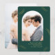 This modern two photo wedding invitation features an elegant print of simple golden colour curvy wisps on a beautiful deep emerald green background. The front includes a trendy geometric arch shape photo, and the back is a full bleed photo of the happy couple.