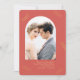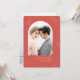 This modern two photo wedding invitation features an elegant print of simple golden colour curvy wisps on a vibrant red background. The front includes a trendy geometric arch shape photo, and the back is a full bleed photo of the happy couple.