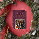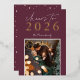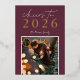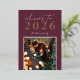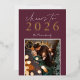 A festive and elegant New Year holiday card design featuring a favourite photo framed by a white deckled edge border on a burgundy plum background. "Cheers to [Year]" appears above in white hand lettered script and gold foil lettering. Personalise with your family name in handwritten script.