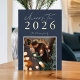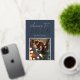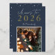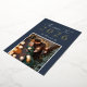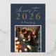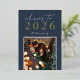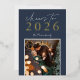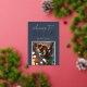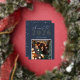 A festive and elegant New Year holiday card design featuring a favourite photo framed by a white deckled edge border on a navy blue background. "Cheers to [Year]" appears above in white hand lettered script and gold foil lettering. Personalise with your family name in handwritten script.