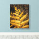 Striking botanical photograph of a golden yellow fern frond. The fall leaves have turned yellow with traces of brown. Sun highlights the fern so it stands out from the dark woodland floor.