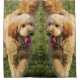 This cute goldendoodle dog photo shower curtain features an adorable mirrored photo of a Golden Doodle puppy. Add your own custom message to make this design your own! Photography created by award-winning photographer Maria Jeffs.