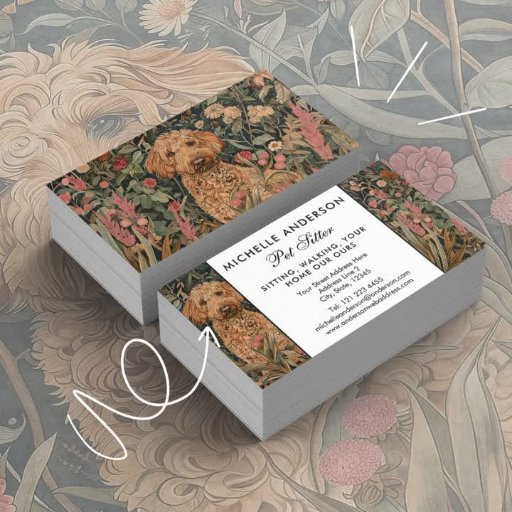 Charming illustration a Goldendoodle in an old English garden in the style of William Morris.