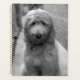 An adorable furry Goldendoodle puppy sitting on a backyard concrete walk along a brick wall in black and white.