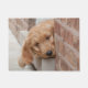 An adorable eleven week old Goldendoodle with bright eyes curiously peeks out from a doorway in a brick wall