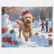 A fluffy Goldendoodle runs playfully through the snowy winter scene, wearing a festive red Christmas hat. This lively design highlights the breed’s curly coat, affectionate nature, and cheerful personality while capturing the joyful spirit of the holiday season. A heartwarming winter moment filled with festive charm.