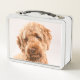 This is a standard metal lunchbox that appears to work just fine. We designed this box ourselves with an uploaded photo and custom text on the front and back. It looks absolutely beautiful except the front of the lunchbox is not centered like it shows in the photo. The print borders don't align with the inset flat part of the box where the preview photo online showed it perfectly centered in there. The back looks nice and centered though.