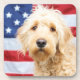 Goldendoodle sits proudly in front of the American flag on Memorial Day.