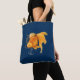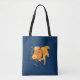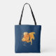 Nautical tote bag with fantail goldfish, rudder and anchor illustration on navy blue background.