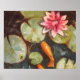 This goldfish or koi swimming in a water lily pond is a classic look at a universally beautiful subject. The painting is done by Florida artist Mary Hubley. Goldfish or koi swimming under several lily pads. A beautiful addition to any home décor, a lily pond with pink water lilies is something that the classic impressionists have created, especially Claude Monet when he created many lily pond images in France. The lily pond, pink water lily, and koi are beautiful settings. Peaceful koi, beautiful lily pads, and serene lily flowers are perfect!