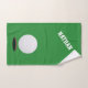 Golfer's sweat hand towel done in a green, with graphics of a golf ball over a hole. Bold white text can be personalised to read what you want.