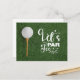 Get ready to par-tee with this playful postcard featuring a golf ball on vibrant green grass and the fun phrase, "Let's Par-Tee." Perfect for sending invitations to golf tournaments, birthday parties, or any celebration with a sporty twist. Customise it for your special event or just share some golf-themed joy!