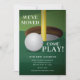 We've moved ... come play moving announcement featuring a golf ball on the greens.