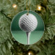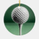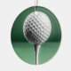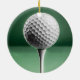 A white golf ball on a white tee in front of a green background on a circular ceramic ornamental decoration.