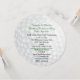 Unique round Pre Wedding Day Festivities Invitation, with graphics of a white pitted pattern golf ball look. Personalise the black and green text to suit your golf party needs. Matching RSVP cards available.