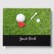 Golf ball with tee and red heart on green wedding guest book