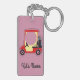 A red gold cart seen sideways, complete with bag and clubs, without people,