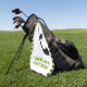 Golf club and ball black, green custom golf towel design that features a minimalist icon of a black golf club and ball, your text and a border with green, black and white stripes.