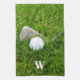 Custom golf themed kitchen towel featuring a golf club and ball on green grass. Use the online template fields to personalise with a name and monogram.