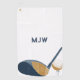 Create a personalized gift that's perfect for your favorite golfer. This golf towel is ready to be personalized with initials or other custom text in navy blue lettering above my realistic style illustration of a golf ball and golf club in shades of blue and gold.