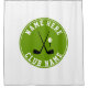 Golf crossed clubs, ball and name green shower curtain. It showcases a minimalist pictogram icon of black crossed golf club, and a ball on green. There is custom text with the club's and the golfer's names and a white border around it.