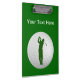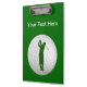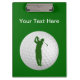 Golf theme custom clipboard with image of a golfball, golfer swinging a golf club, and text you can personalise on both sides. Designed as a custom business clipboard for a golf course, golf instructor, or school.