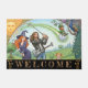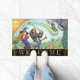 Welcome Doormat for house of Golf / Golfers featuring happy modern Family with a Witch mum, Rock-star dad, little girl and magic of Art Nouveau style with peacock and leprechaun flying on golf ball. Original, fun house mat for any occasion. Easily customise "welcome" text.