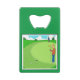 Fun bottle-opener for the keen golfer features not one but TWO fun colour cartoons - one, an unsuccessful Golf Tee-Off, and the other, (on the reverse) a Missed-Putt Cartoon. Handy credit card style bottle opener for a golfer. Gift for a golfer. Golfing gift.
