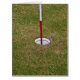 Golf hole on green with red and white flagstick. Photography.