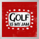 "Golf Is My Jam" is a fun text design with a white accent shape surrounded by white whimsical textured dots.