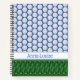 Golf balls create a bright polka dot pattern on a blue background on both the front and the back of this notebook. On the front, golf clubs are also used in a complementary pattern on a green background, and there is a white stripe for you to personalise with a name or other text.