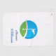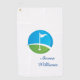 This golf towel is shown in a white colour with a blue and green golf course art graphic print.