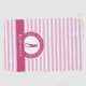 Trendy custom design features a female golfer silhouette set in a pink and white shape bordered with curved text "GOLF GOLF GOLF GOLF" in crisp white font. A black band holds a template for a monogrammed name, initials or custom text. The background is a modern light pink and white stripe pattern. If you have any questions regarding this or any of my designs please contact beachpausedesigns@gmail.com. Custom requests accepted.