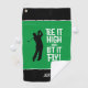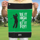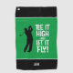 Elevate your golf game with this "Tee It High & Let It Fly!" towel, featuring a bold mid-century font and golfer silhouette on a green rectangle with white stripes against a sleek black background. Personalise it with initials, a name, or short text using the easy template. The design is versatile, offering adjustable colour options for the towel, golfer, and text. Its vector graphic format ensures sharp clarity on all Zazzle products. Perfect for golf enthusiasts seeking a funny, practical addition to their gear or a thoughtful gift for the golfer in your life. Message the designer with custom colour requests or questions.