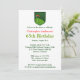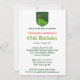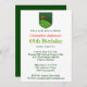 You can personalise all the text on this 65th golf themed birthday party invitation. You can change the text and number on the front and use this for a 50th, 60th, 70th or other birthday. The design features a green emblem with a flag at a hole. Green, red, and white.