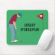 Golfer, wearing a cap, red shirt and blue pants, putting a golf ball into a hole design mousepad. Customise the text.