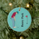 Teal personalised golfer, wearing a cap, deep red shirt and blue pants, putting a golf ball into a hole Christmas ornament.