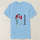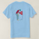 Golf themed golfer, wearing a cap, deep red shirt and blue pants, putting a golf ball into a hole marked by a red flag design t-shirt. Customise the text.