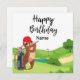 Golfer sloth is golfing on a green birthday card. The card is decorated with green and white stripes. Golfer sloth is holding a golf club in one hand"Happy Birthday" is written in green lettering on the front of the card.