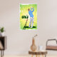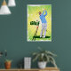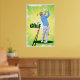 Bright yellow and green golfer swinging a golf club with sunbursts in the back poster.