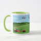 Golfing Father's Mug Features a golf course background with a sand trap and golf flag, a red golf cart, a blue golf cart both with golf bags. Stylised text is # 1 Dad. Perfect gift for Dad this Father's Day. This design was created using original artwork© www.delightful-doodles.com